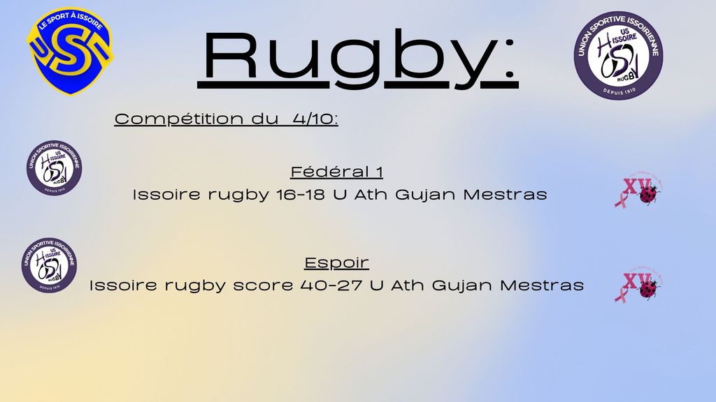 | Rugby équipe fédéral 1 | 2ème | 78 | 22 | 15/0/7 | |